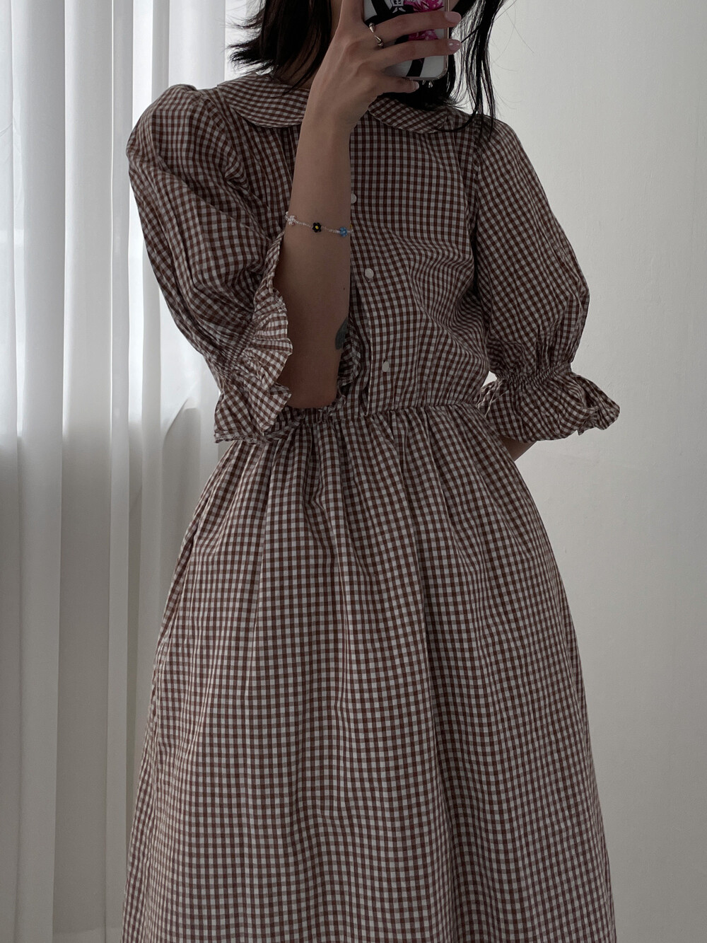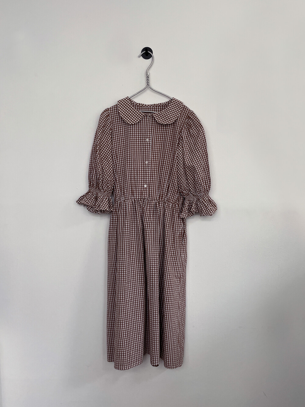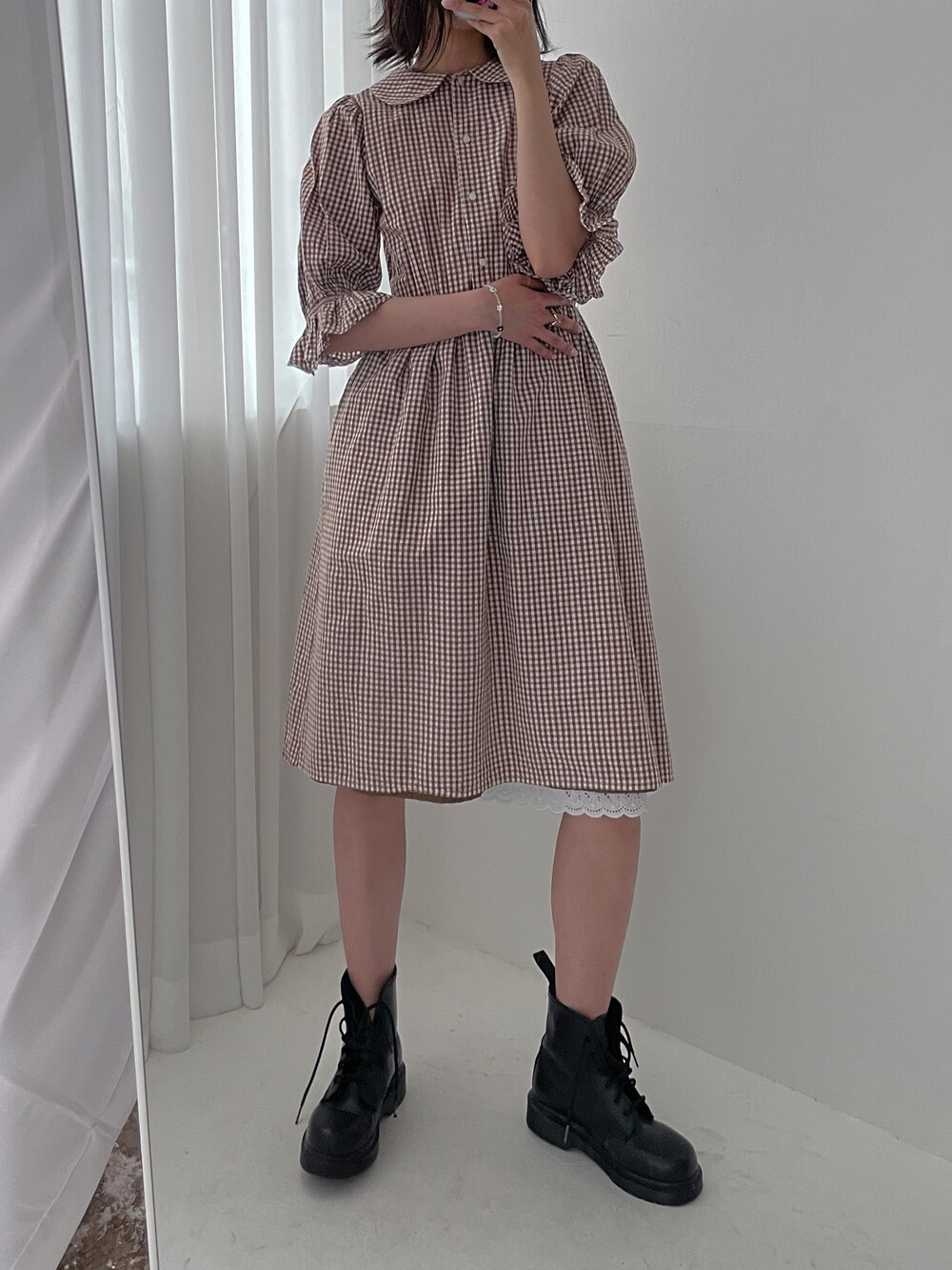 플랫칼라와 퍼프 슬리브의 단정한 실루엣이 매력적인 코튼 원피스입니다.