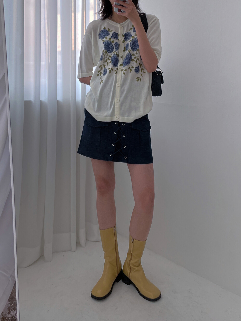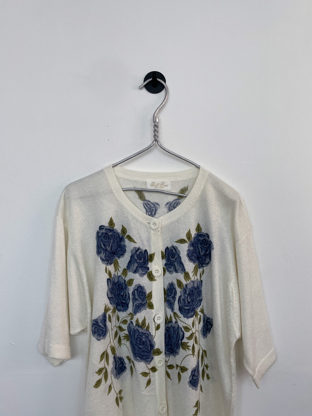 플로럴 드로잉 디자인으로 매력적인 반팔 니트 가디건입니다.