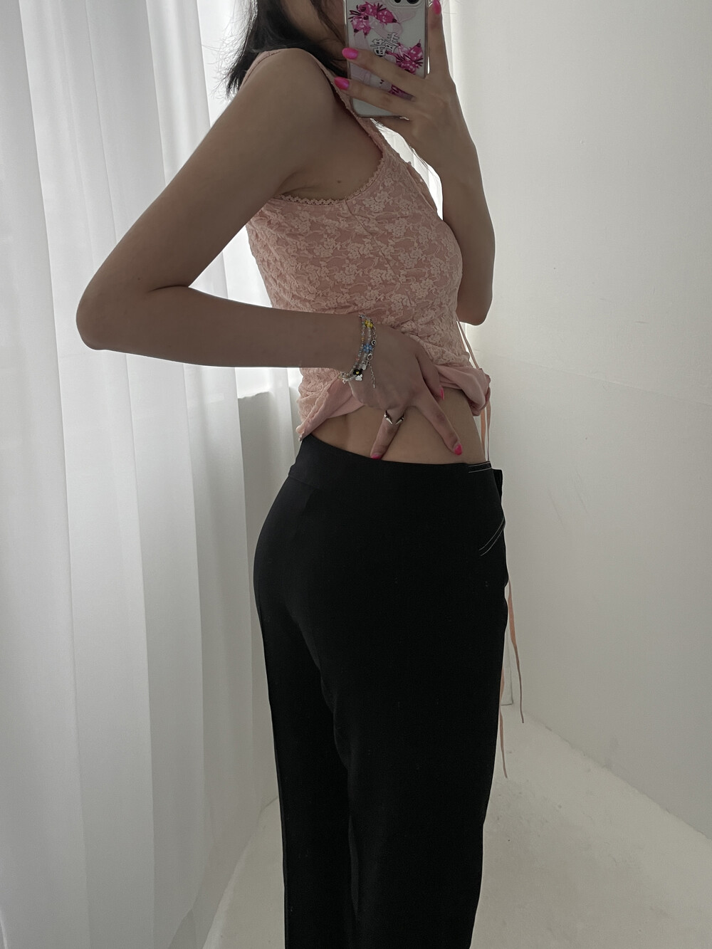 벨티드 디자인의 로우라이즈 슬랙스